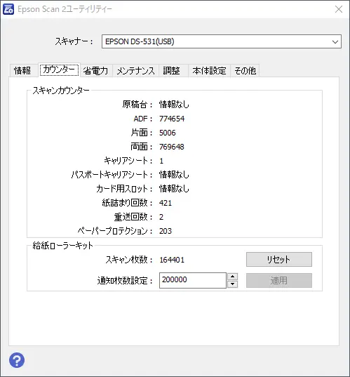 そして、交換時のわが家のスキャンカウンター情報。 結果的には、スキャナー本体の耐久枚数の2倍近く使っていました(77万スキャン超!)。